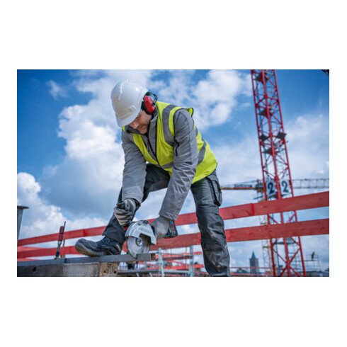 • Zu den Merkmalen des Winkelschleifers gehören Wiederanlaufschutz, Sanftanlauf und ein Seitengriff mit Vibration Control
