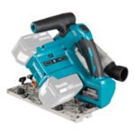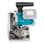 Eine präzise Tauchkreissäge mit bürstenlosem Motor. Die Säge erreicht mit einem Sägeblattdurchmesser von 165 mm eine Schnitttiefe von 56 mm. Der Schnittpunkt bleibt in allen Neigungen (-1° bis +48°) an exakt der gleichen Stelle. Die Säge kippt auch bei größtem Neigungswinkel nicht von der Führungsschiene.