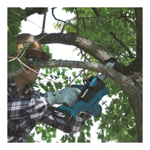 Die handliche Kettensäge von Makita wird von einem kraftvollen Motor angetrieben, der eine hohe Kettengeschwindigkeit und schnelle Schnitte ermöglicht. Zur Sicherheit jedes Anwenders ist das Gerät mit einer Motorbremse für einen Sägekettenstopp innerhalb von 0,5 Sekunden ausgestattet. Die Kettenschmierung erfolgt automatisch und ein Sägekettenwechsel sowie die Einstellung der Kettenspannung werden werkzeuglos vorgenommen. Für den sicheren Halt und bequemes Arbeiten sorgt der praktische Handgriff mit eingelegtem Gummipolster. Eine Akkuladung ist ausreichend für eine Öltankfüllung.
