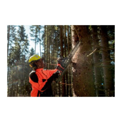 Die Akku-Kettensäge arbeitet mit einem leistungsstarken Lithium-Ion-Akku, der mit computergestützter Ladetechnologie ausgerüstet ist. Nach einer durchschnittlichen Ladezeit von 22 Minuten bei einem Lithium-Ionen-Akku mit 3,0 Ah ist das Gerät schnell wieder einsatzfähig. Das gefürchtete Kickback wird durch den Anschlag an der Schwertspitze wirkungsvoll verhindert. Zum Schutz des Anwenders ist das Gerät mit einem speziellen Handschutz sowie einem Sicherheitsschalter mit Einschaltsperre ausgerüstet. Die Top Handle Akku-Kettensäge ist ausschließlich für gewerbliche Anwender mit Spezialausbildung zugelassen. Zu den Einsatzgebieten des kompakten Werkzeugs zählen die Bereiche Gartenbau, Land- und Forstwirtschaft sowie Grundstücks- und Landschaftspflege. Auch bei Sägearbeiten in geschlossenen Räumen und beim Sägen von Brennholz kommt das effiziente Gerät zum Einsatz.