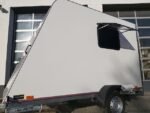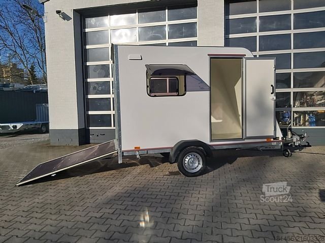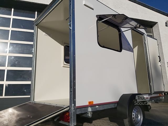 TFS S Midi+ Kofferauflieger, Innenraum 320 x 150 x 180 cm, niedrige Ladefläche, 750 kg Tragfähigkeit, V-Rahmen-Chassis, Gummifederung, gebremst, zugelassen bis 100 km/h, 30 mm isolierte Sandwichpaneele, glatte weiße Lackierung, abschließbare Heckrampe, abschließbare Seitentür mit Riegelschloss, Seitenlüftung, Front und Dach aus weißem Polyesterprofil, aerodynamische Schrägform, 15 mm Sperrholzboden mit PVC-Beschichtung (ohne Zurrösen), 2 Seitenfenster mit Moskitonetzen und Jalousien, moderne Beleuchtung, 12-V-LED-Deckenleuchte, 230-V-Elektropaket, Stützrad, 4 Stabilisierungsstützen…
